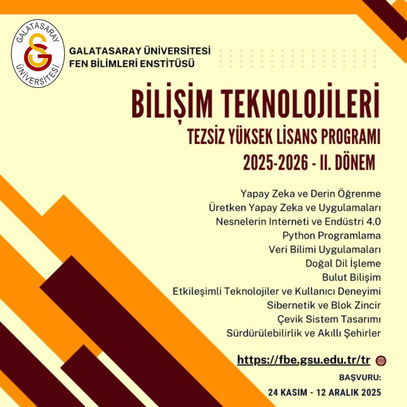 Galatasaray Üniversitesi Fen Bilimleri Enstitüsü Bilişim Teknolojileri Tezsiz Yüksek Lisans Programı II. Dönem olarak Ocak 2026'da başlayacaktır.